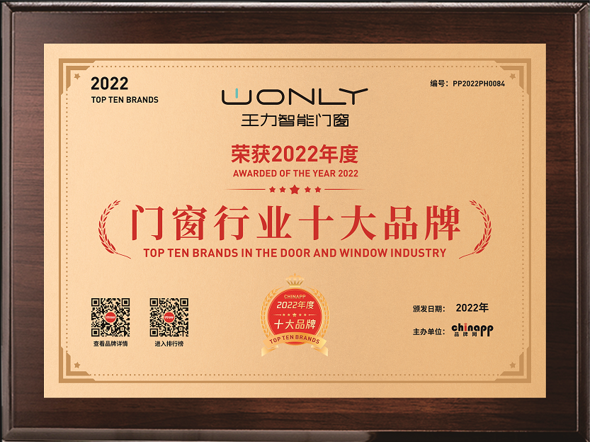 重磅!王力智能門窗榮獲2022年“門窗行業十大品牌”獎項!